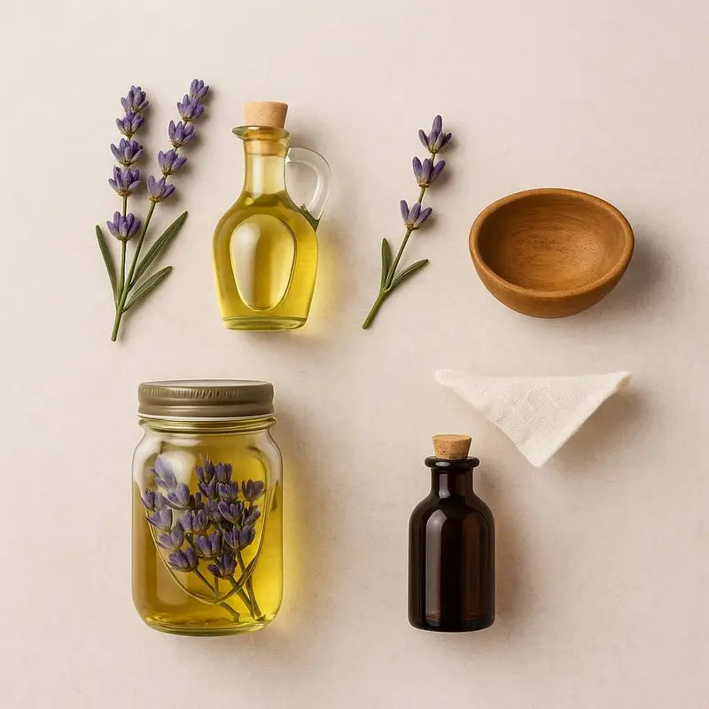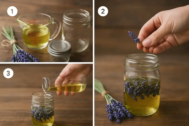 Place the lavender into the jar, then pour the oil over it until the flowers are fully covered. Close the jar and place it in a warm, sunny spot for about 2–4 weeks. Shake it gently from time to time so the active ingredients can release more effectively.